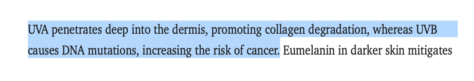 Ánh nắng mặt trời là nguyên nhân hàng đầu gây lão hóa da sớm. Trong đó, tia UVA có khả năng xuyên sâu vào lớp bì, phá hủy collagen và elastin, khiến da lão hóa sớm. Ngoài ra, tia UVB lại gây bỏng rát, sạm nám và tăng nguy cơ ung thư da. Một nghiên cứu của Cureus đăng trên Pubmed đã chứng minh điều đó.