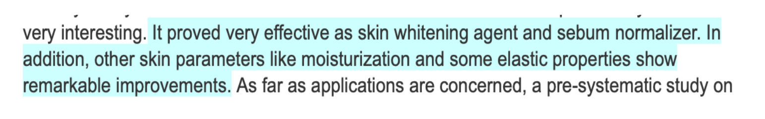 - Azeloglycine: ResearchGate đã chứng minh hiệu quả của Azeloglycine trong việc làm trắng da và cân bằng bã nhờn. Ngoài ra, các thông số khác của da như độ ẩm và một số đặc tính đàn hồi cũng cho thấy sự cải thiện đáng kể