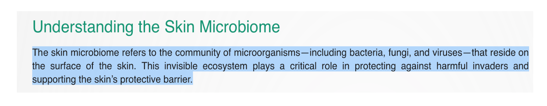 Da chúng ta giống như một khu rừng sinh thái thu nhỏ, nơi hàng tỷ vi khuẩn và vi sinh vật cùng tồn tại. Nghiên cứu cho thấy, khi cân bằng hệ vi sinh giúp bảo vệ da khỏi tác nhân gây hại. Nhưng khi mất cân bằng, vi khuẩn có hại phát triển mạnh, gây nên tình trạng viêm, mụn kéo dài.