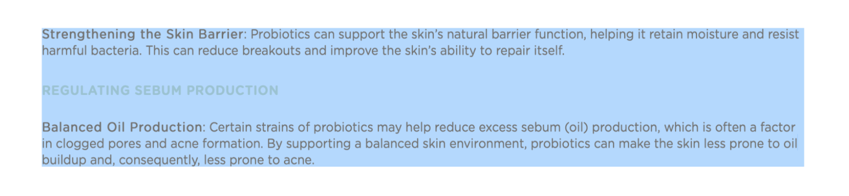 - Lactobacillus (Probiotics sống): Duy trì hệ vi sinh có lợi, giúp da giữ ẩm, ức chế vi khuẩn và nấm gây mụn. Điều này có thể làm giảm mụn trứng cá và cải thiện khả năng tự phục hồi của da. Ngoài ra, một số chủng men vi sinh có thể giúp giảm sản xuất bã nhờn. Đây là yếu tố gây tắc nghẽn lỗ chân lông và hình thành mụn. Bằng cách hỗ trợ một môi trường da cân bằng, da ít bị tích tụ dầu hơn, từ đó giảm nguy cơ bị mụn.