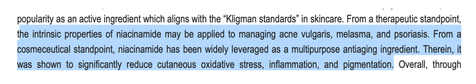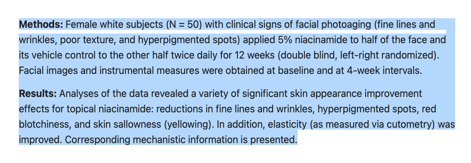 - Một nghiên cứu lâm sàng khác về niacinamide được đăng trên Pubmed Central cũng chứng minh hiệu quả rõ rệt. Họ sử dụng 5% niacinamide cho 50 phụ nữ trong 12 tuần. Tần suất dùng niacinamide hai lần/ngày. Phân tích dữ liệu cho thấy niacinamide có nhiều tác động tích cực về vẻ ngoài của da. Nó giảm nếp nhăn và vết chân chim, các đốm tăng sắc tố. Da sáng màu và độ đàn hồi của da cũng được cải thiện