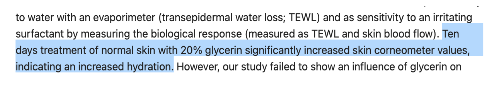 - Glycerin: Giúp hút ẩm từ môi trường và lớp sâu của da lên bề mặt. Nhờ đó, giúp da không bị khô, căng, bong tróc, tăng khả năng giữ nước. Một nghiên cứu trên Pubmed chứng minh, dùng kem chứa 20% glycerin trong 10 ngày trên da có sự thay đổi. Độ ẩm da (đo bằng máy đo độ ẩm corneometer) tăng lên rõ ràng. TEWL (mất nước qua da) cũng giảm, chứng tỏ hàng rào da được cải thiện.